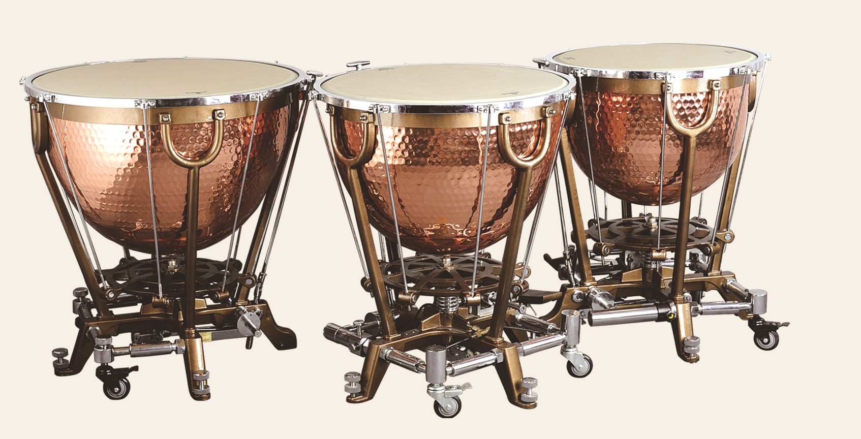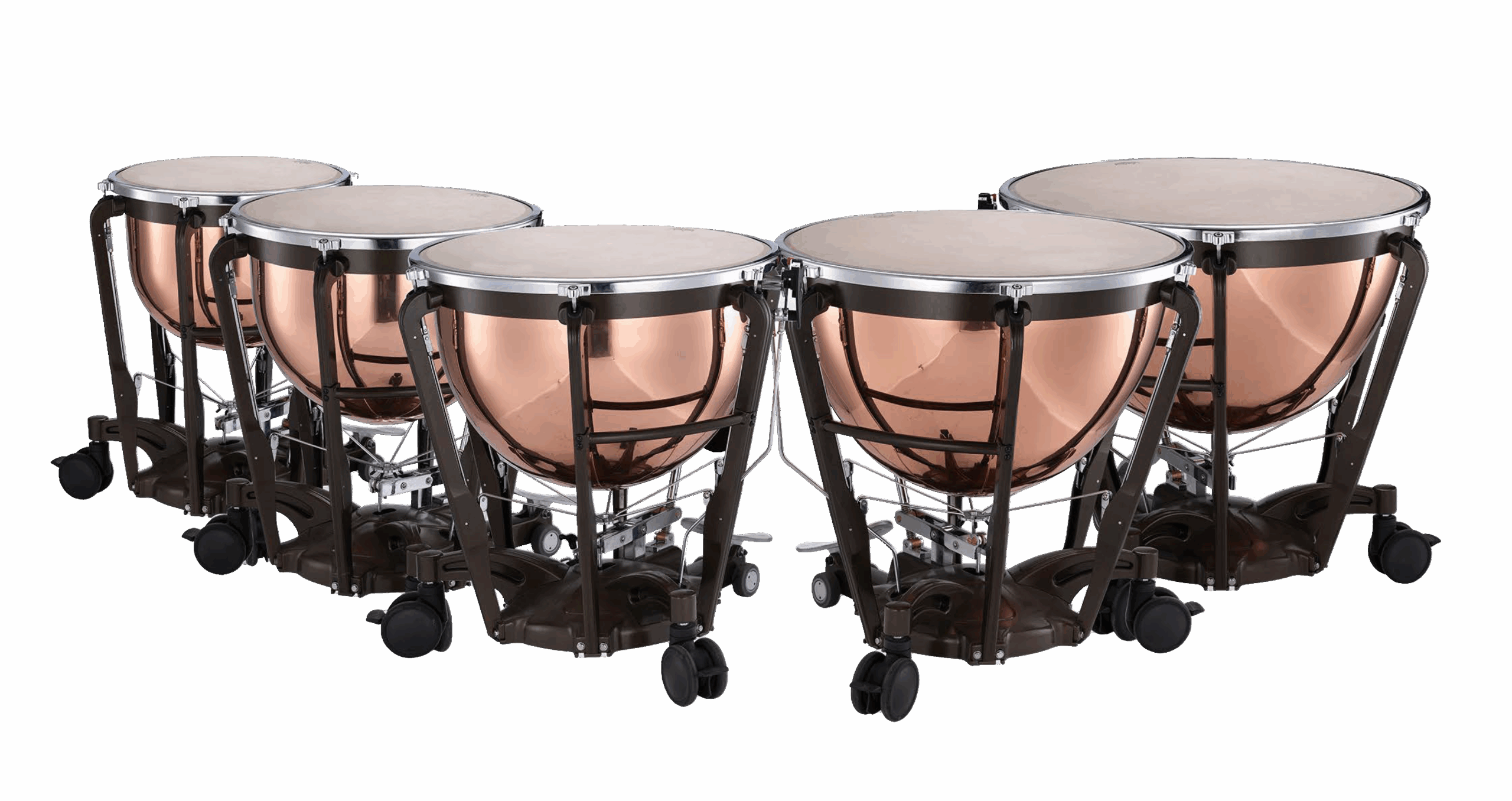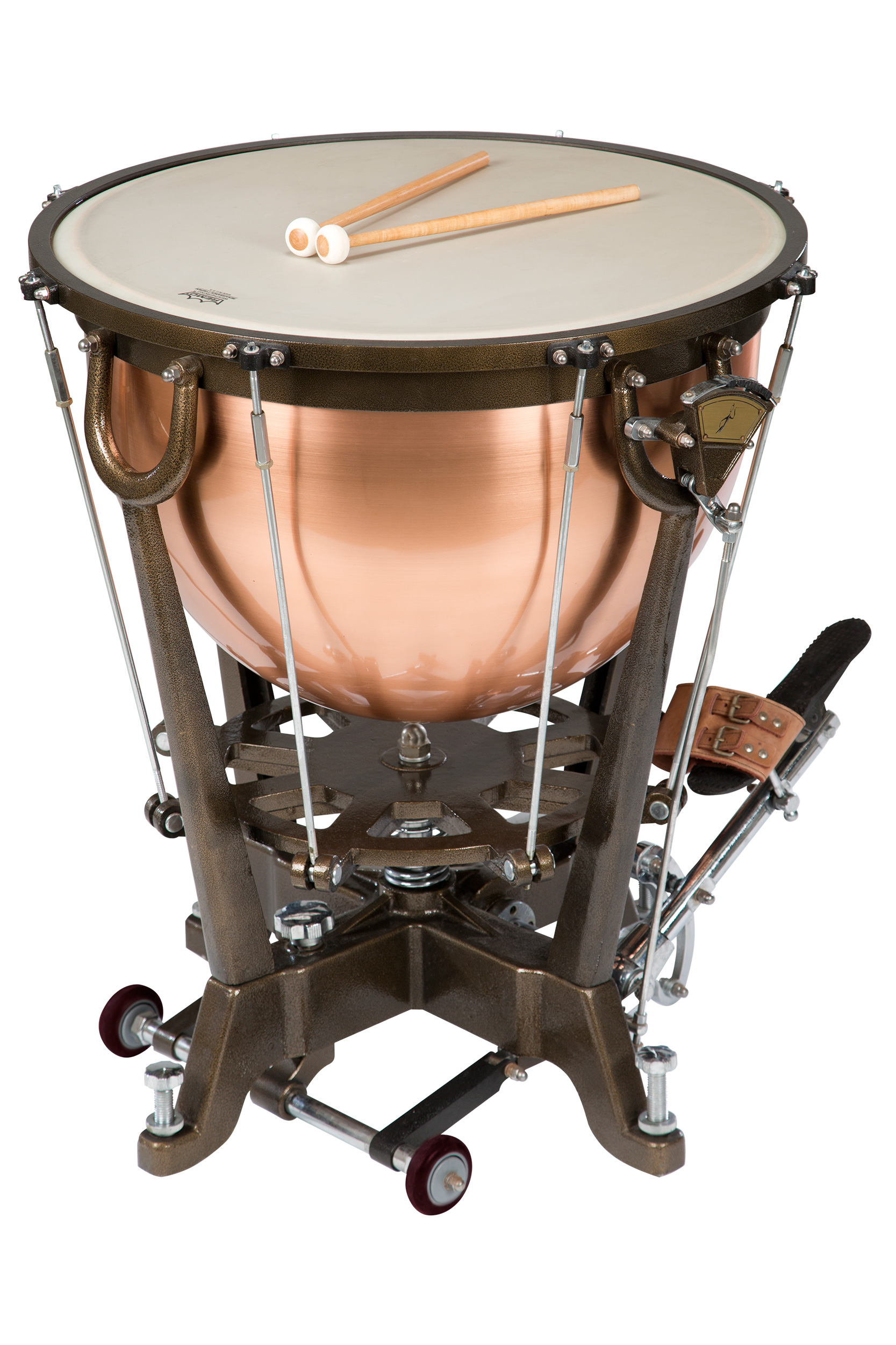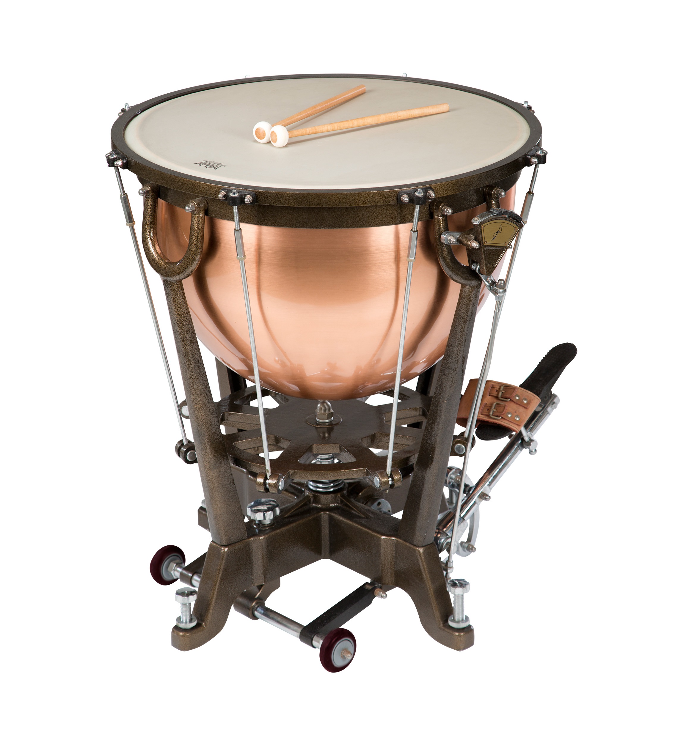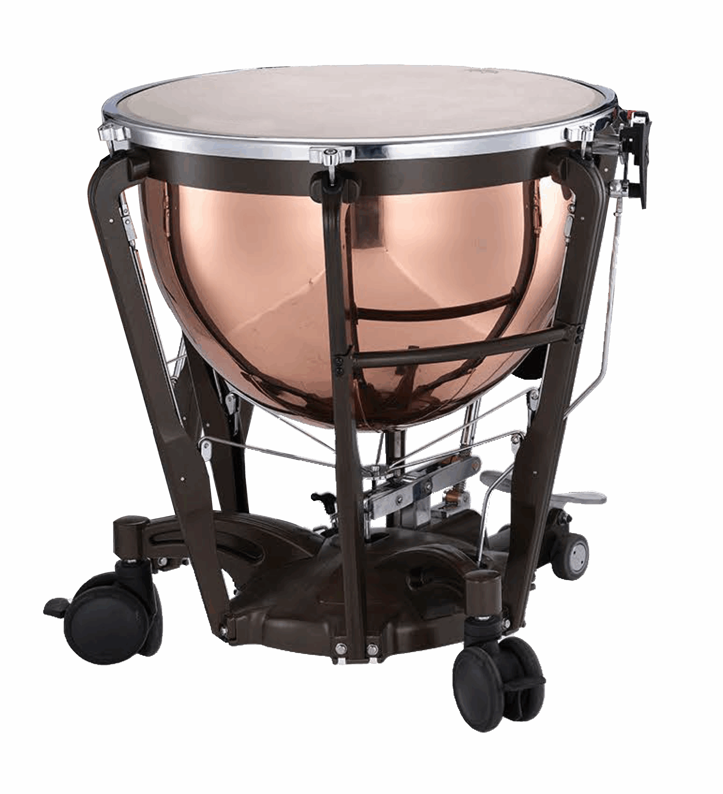 The wheels on the timpani allows for easy transport and secure placement during performance and feature braking. Contributing to the ease of movement and firm placement of the timpani.