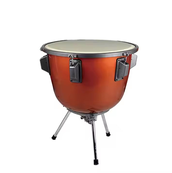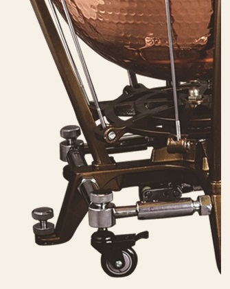 The wheels on the timpani allows for easy transport and secure placement during performance and feature braking. Contributing to the ease of movement and firm placement of the timpani and additionally, three leveling fixing screws to the floor surface.